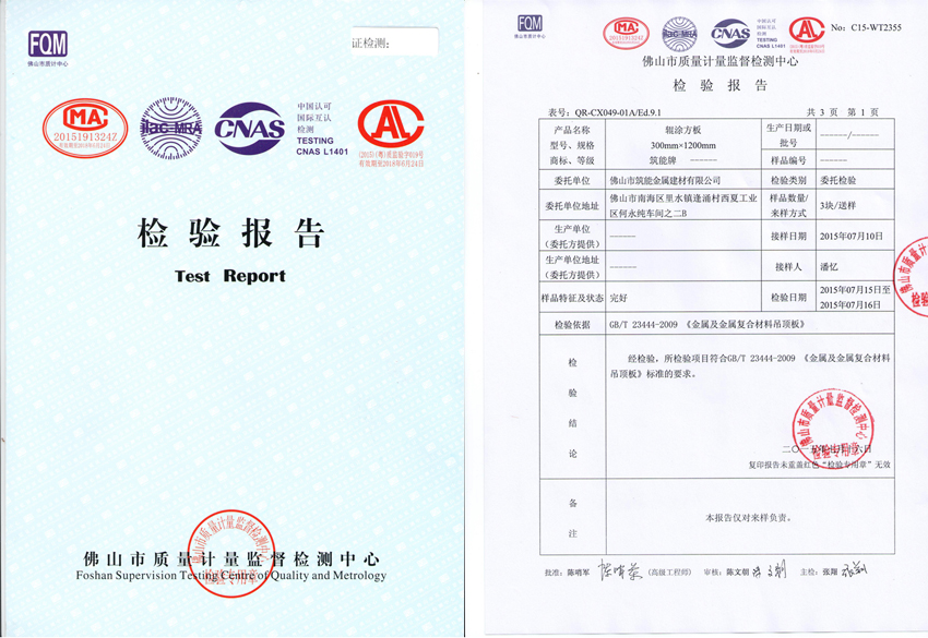 【筑能简讯】热烈祝贺“筑能”预辊涂铝天花板通过国家检验合格