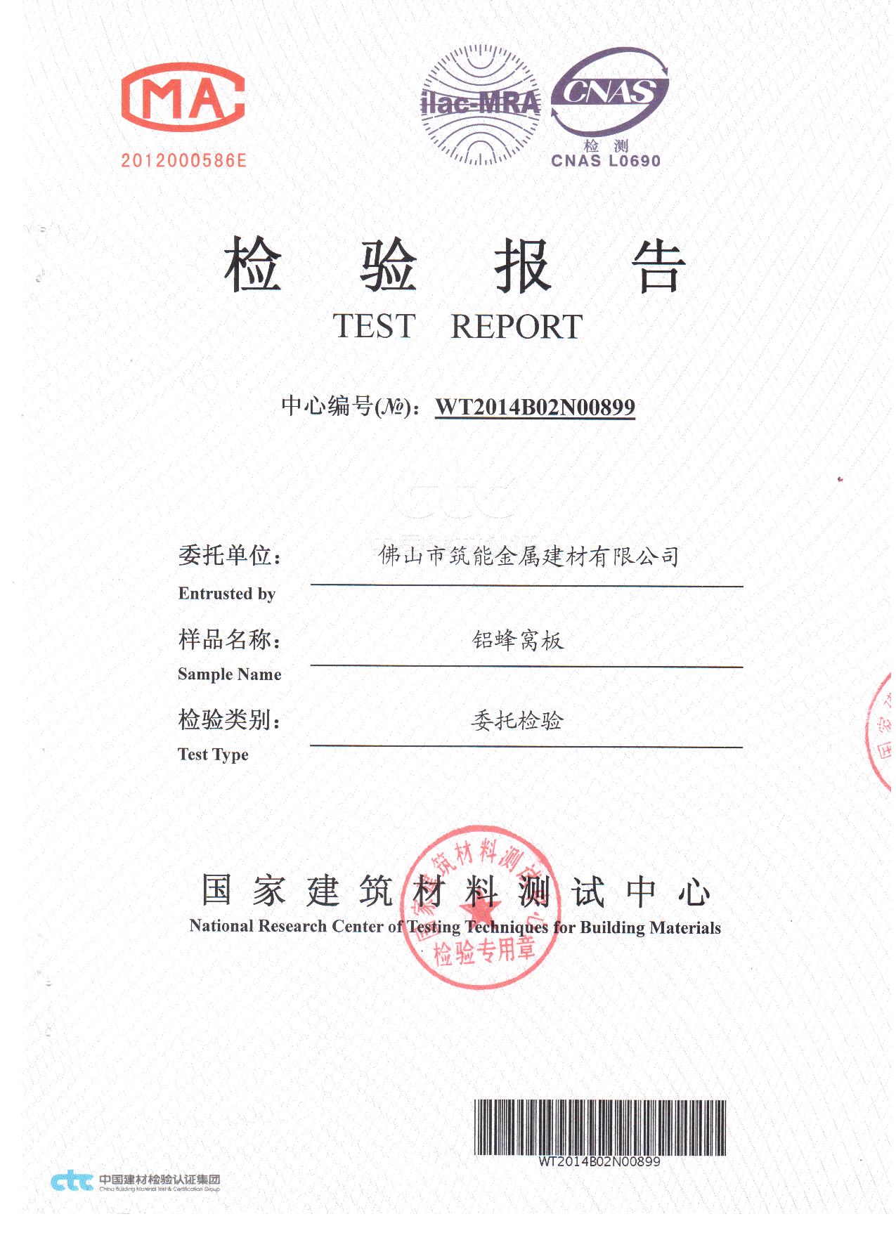 【筑能简讯】热烈祝贺“筑能”铝蜂窝板通过国家检验合格