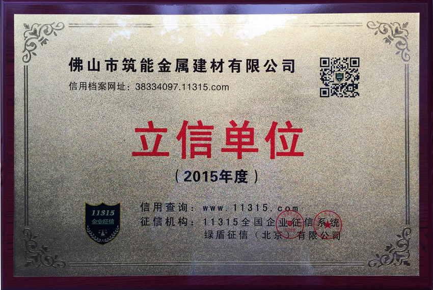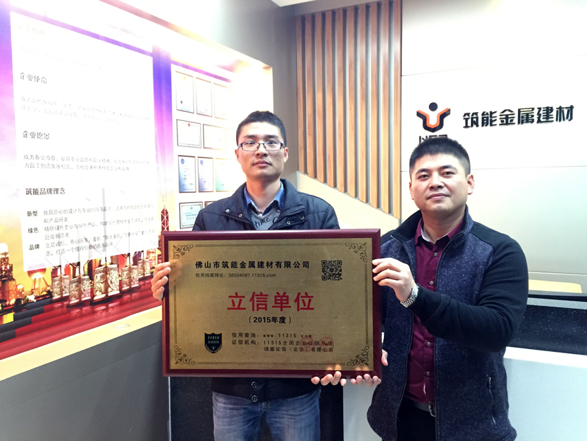 经绿盾征信(北京)有限公司审核通过,佛山市筑能金属建材有限公司被评为11315全国企业征信系统“2015年度立信单位”,并于2015年9月17日正式向我司授牌。